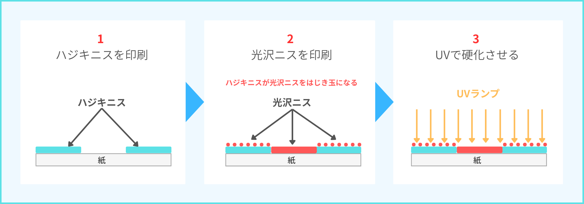 ベースとなる【ハジキニス(下刷りニス)】に【光沢ニス】が乗ると弾く作用により球のような形状になります。その球が光を乱反射する性質、かつざらっとした手触りで表現したのが擬似エンボス加工となります(下図参照)。