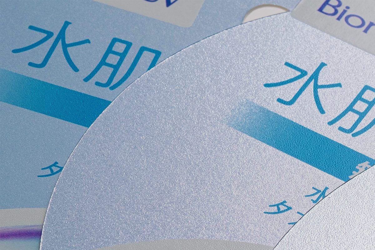 擬似エンボスは、実際の金型を用いて浮き上げるエンボス加工とは異なり、2種類のニスの”弾き合い”により【つやつや】と【ざらざら】の対比の表現で”エンボス感”を演出する加工になります。